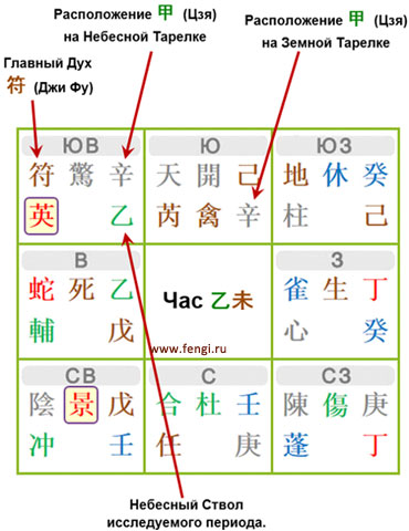 Существует более легкий способ определить местоположение Небесного Ствола 甲 Цзя в раскладе. Расположение 甲 Цзя соответствует местоположению Главного Духа 符 Джи Фу.